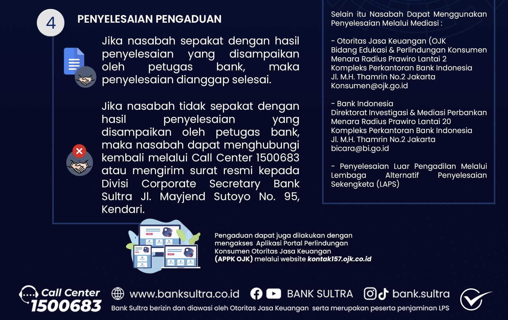 4. Penyelesaian: Jika nasabah puas dengan penyelesaian, pengaduan dianggap selesai.  Jika tidak puas, nasabah dapat menghubungi kembali call center atau mengirim surat resmi ke Divisi Corporate Secretary Bank Sultra di Jl. Mayjend Sutoyo No. 95, Kendari.