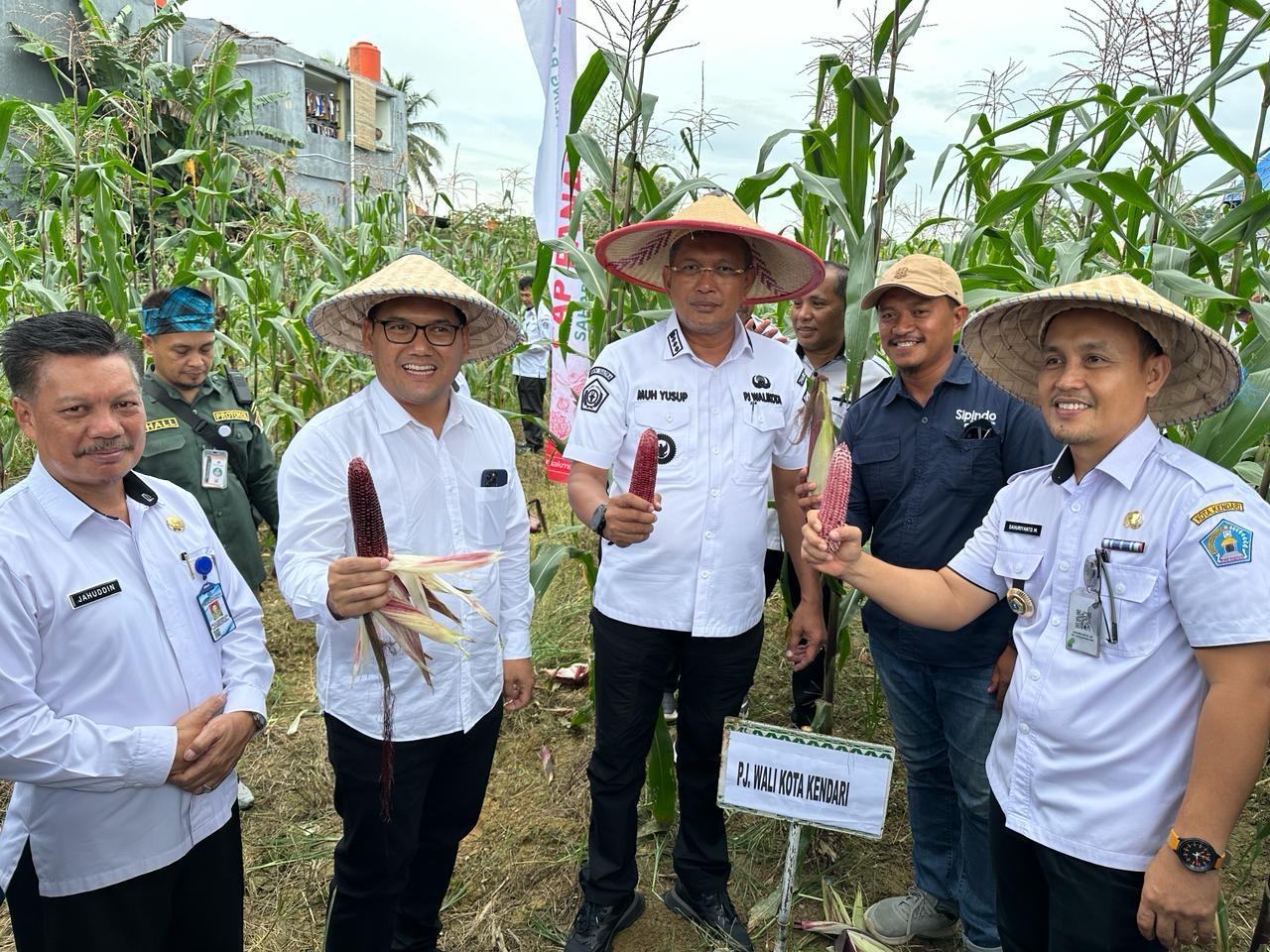 Pj Wali Kendari, Muhammad Yusup didampingi Kepala Dinas Pertanian Kota Kendari, Sahuriyanto saat menggelar panen jagung perdana di Kawasan Perkebunan Baruga beberapa waktu lalu.