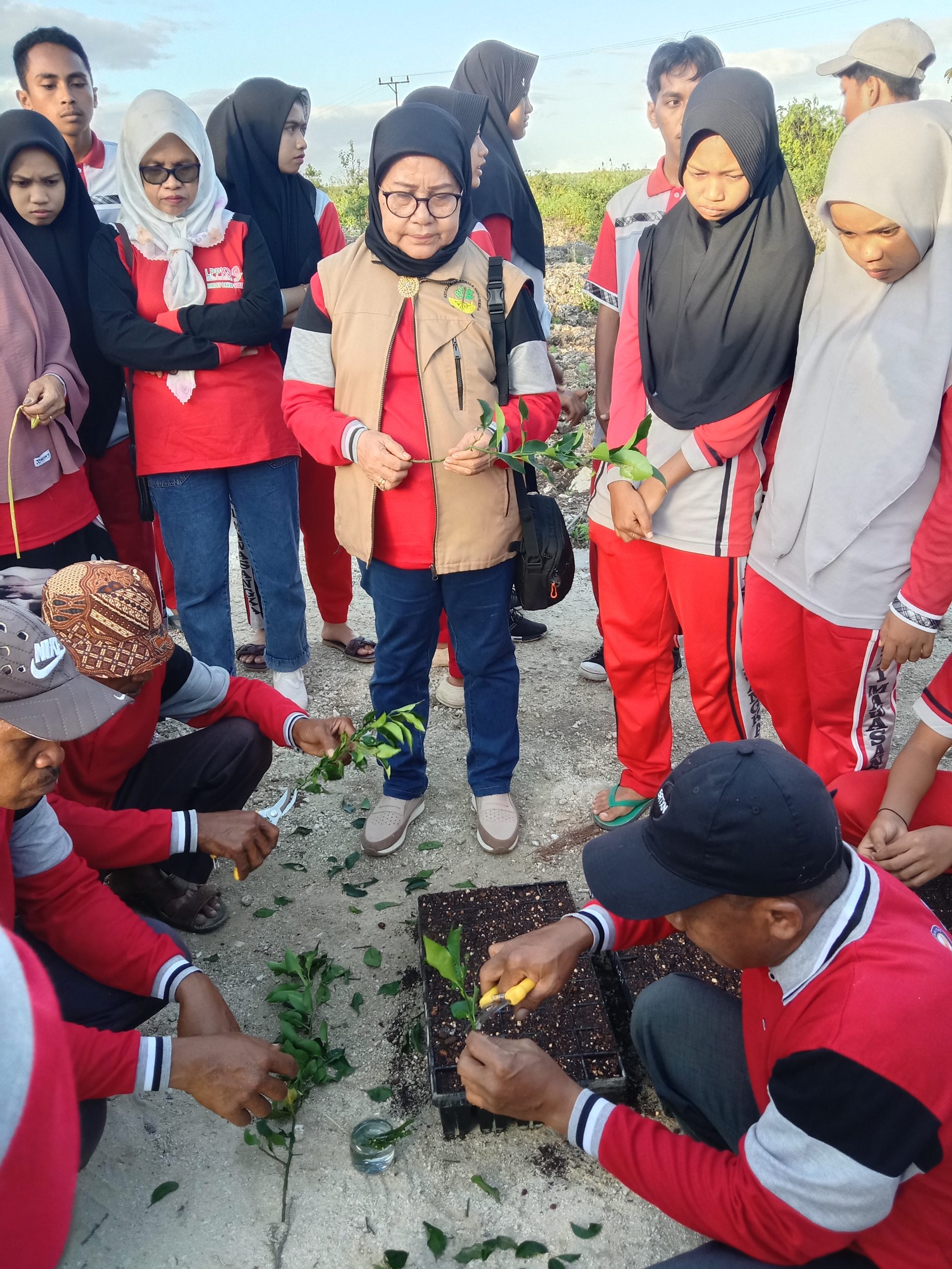Tim dosen UHO saat mengajari poktan dan pelajar cara pengembangbiakan jeruk Siompu dengan stek.