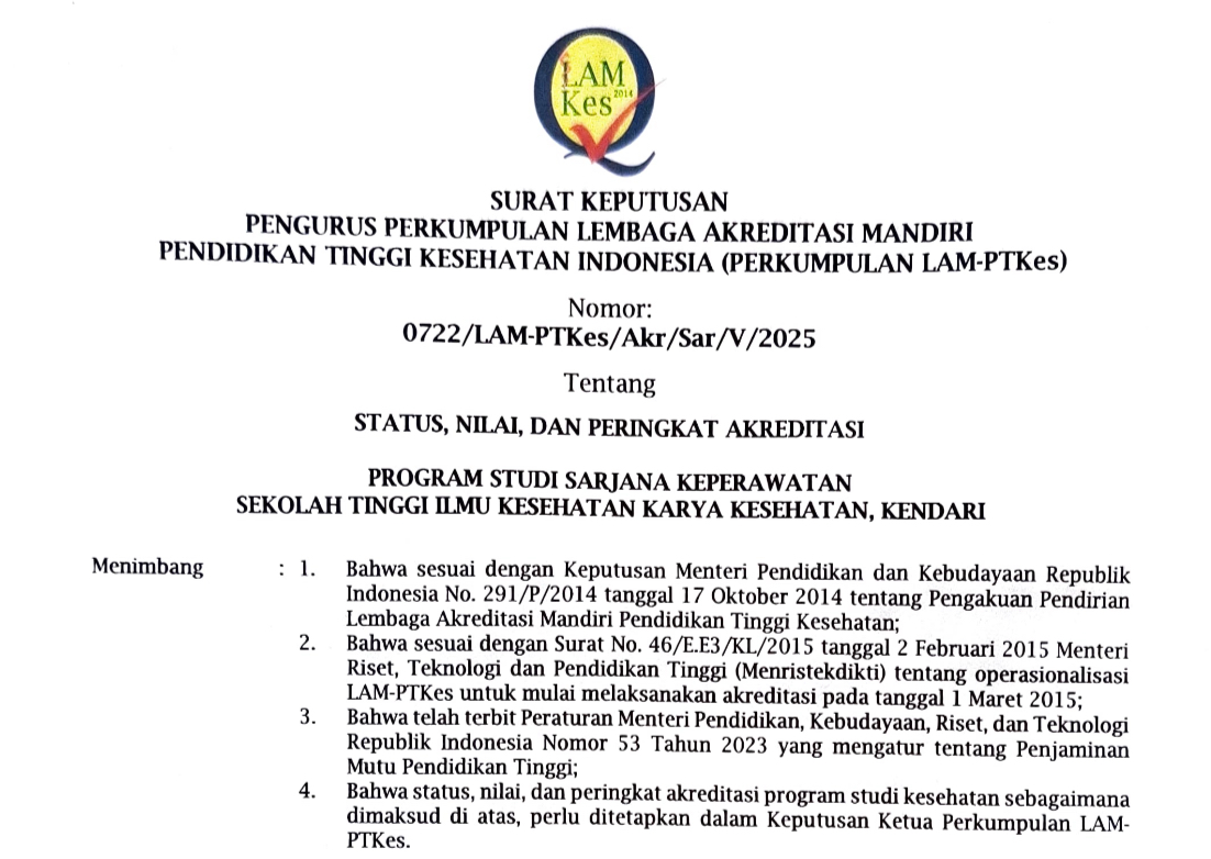 Dengan diraihnya akreditasi ini, STIKES Karya Kesehatan semakin mantap dalam memberikan jaminan kualitas pendidikan yang relevan dengan kebutuhan dunia kerja dan berorientasi pada kesejahteraan masyarakat.