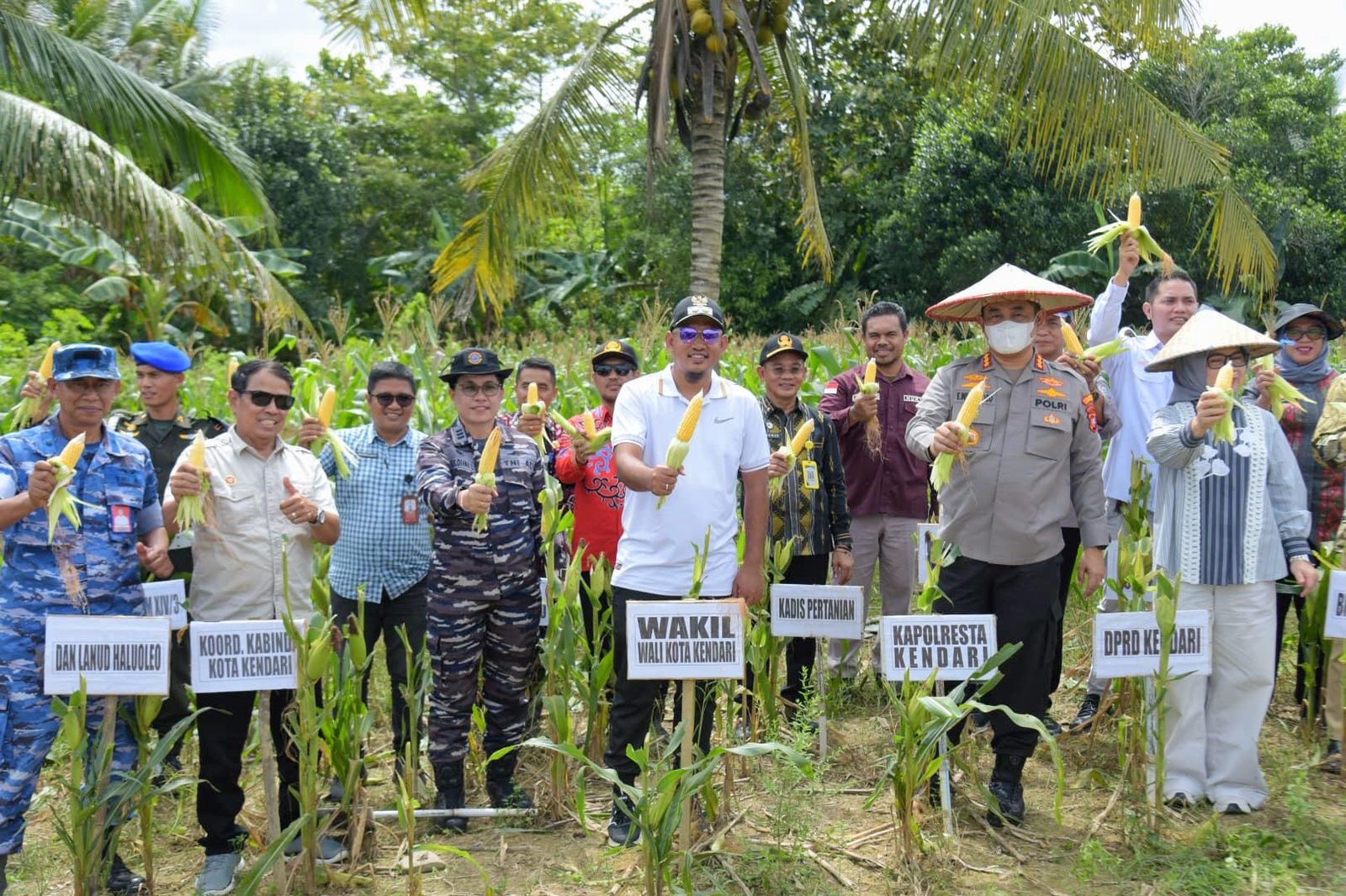 Di Kota Kendari, Sulawesi Tenggara, Wakil Wali Kota Sudirman memimpin panen raya jagung di Kelompok Tani Tani Jaya, Kelurahan Andonohu, Kecamatan Poasia pada Kamis (5/6/2025).