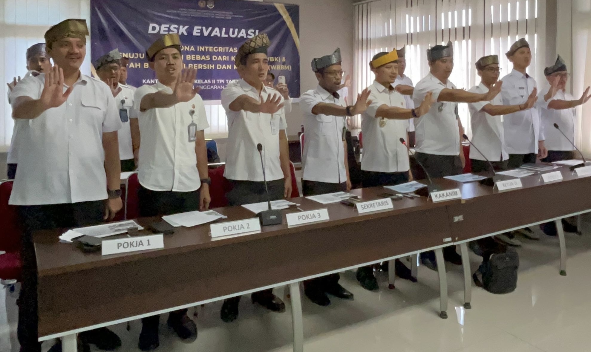 Seluruh peserta mengenakan Tanjak Melayuk saat mengikuti desk evaluasi yang dilaksanakan secara virtual di Ruang Aula imigrasi Tanjung Uban, dipimpin langsung Kepala Imigrasi Tanjung Uban, Bapak Adi Hari Pianto, didampingi Ketua, Sekertaris, para Ketua Kelompok Kerja, serta seluruh anggota tim Zona Integritas.