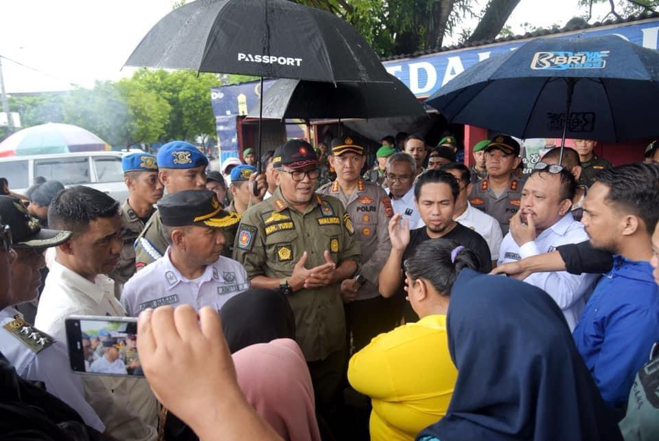 Pj Wali Kota Kendari, Muhammad Yusup tengah berdialog dengan masyarakat terkait penertiban PKL di Kawasan Eks MTQ.