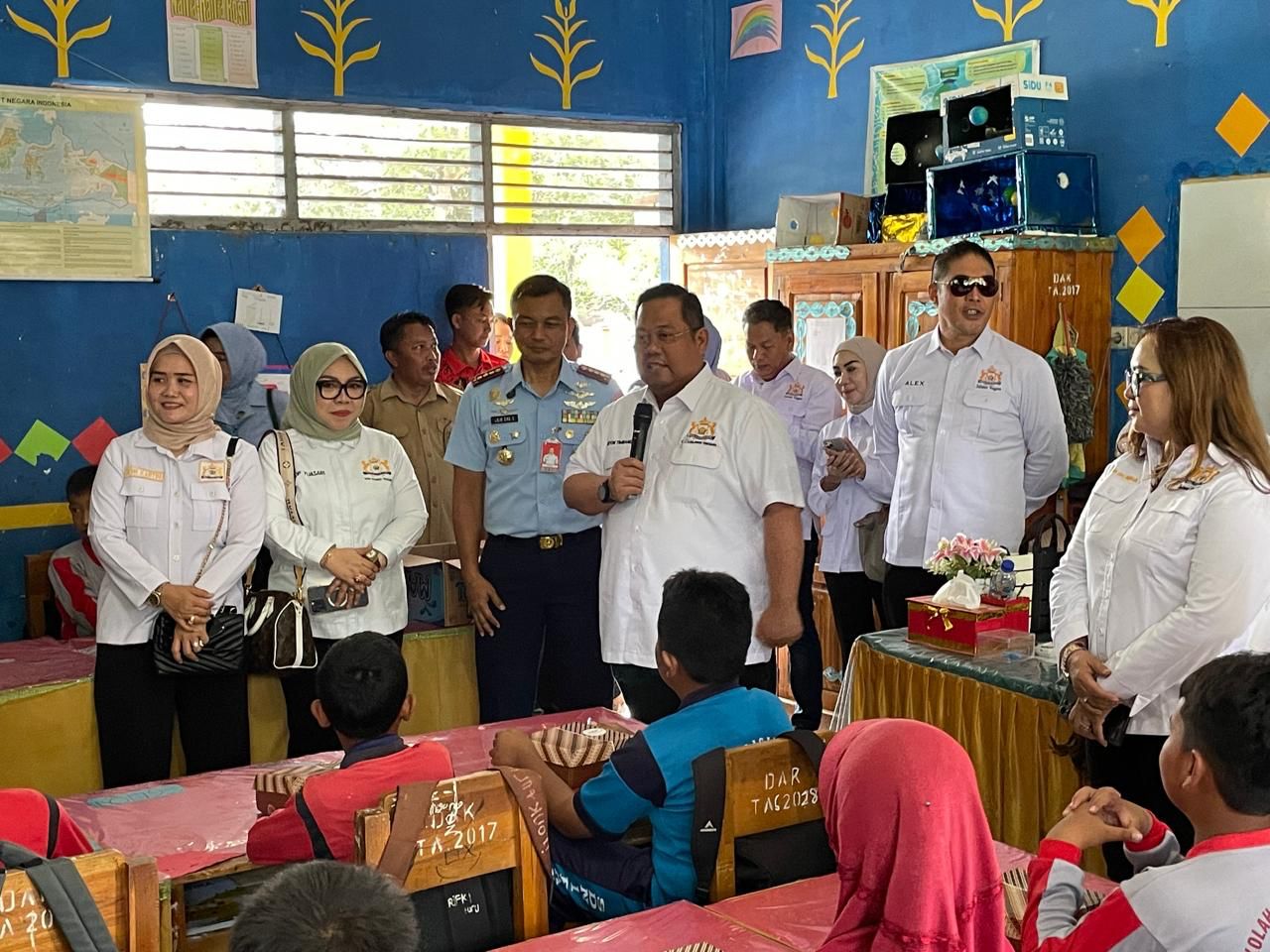 Ketua Kadin Sultra, Anton Timbang didampingi Kolonel Pnb Lilik Eko Susanto, Danlanud Haluoleo Kendari saat uji coba makan gratis di SD Negeri 6 Ranomeeto Barat.