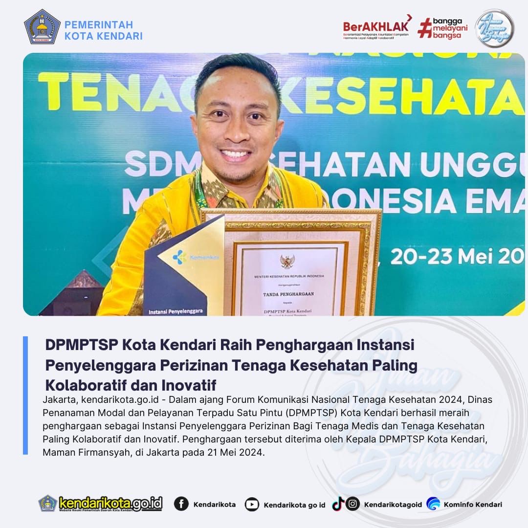 Penghargaan tersebut diterima oleh Kepala DPMPTSP Kota Kendari, Maman Firmansyah, di Jakarta pada 21 Mei 2024.