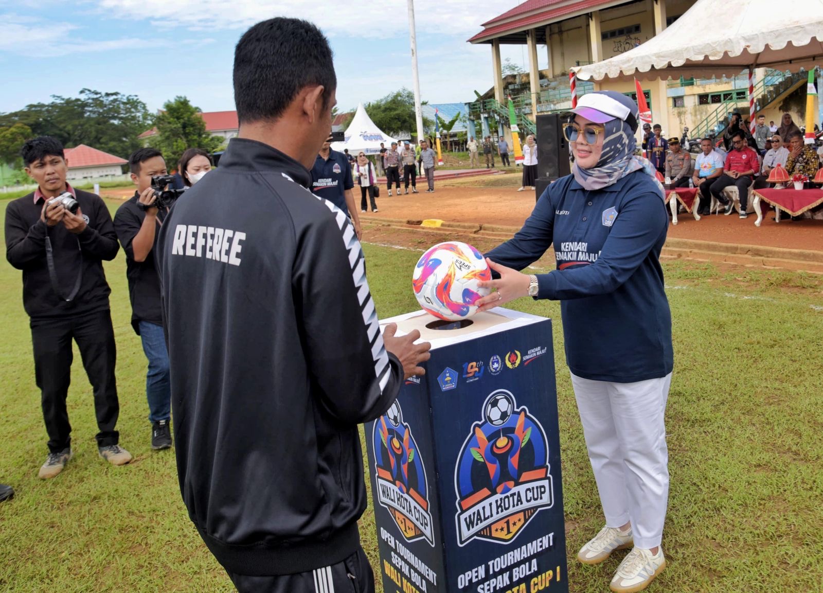 Wali Kota Kendari, Siska Karina Imran menyerahkan bola sepak kepada pemimpin pertandingan Tounamen Sepak Bola Wali Kota Cup 1 2025.