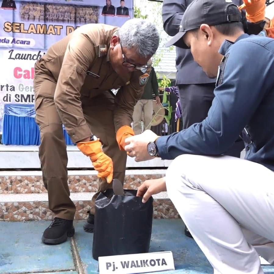 Pj Wali Kota Kendari, Muhammad Yusup saat menanam bibit cabai di Pelataran SMP Negeri 2 Kendari beberapa waktu lalu.