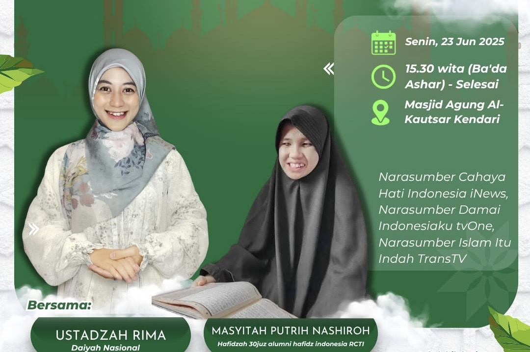 Acara akan diselenggarakan pada hari Senin, 23 Juni 2025, pukul 15.30 WITA di Masjid Agung Al-Kautsar, Jl. Abdullah Silondae, Mandonga, Kendari. Panitia mengundang seluruh masyarakat Kota Kendari untuk hadir dan mengikuti kegiatan ini.