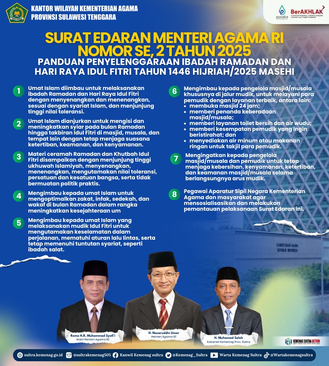 RADARKENDARI.COM, Kendari – Menindaklanjuti Surat Edaran Menteri Agama No. 2 tahun 2025, Kanwil Kementerian Agama Prov. Sultra menyiapkan setidaknya 354 posko Masjid Ramah di jalur mudik yang tersebar di seluruh Kab/Kota se Sultra.