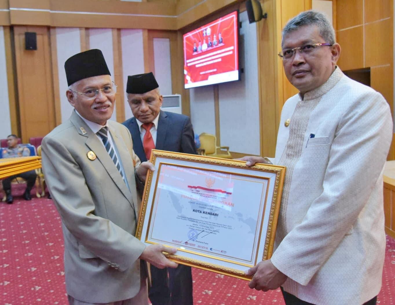 Pj Wali Kota Kendari, Muhammad Yusup menerima piagam penghargaan Kota Peduli HAM yang diserahkan Sekda Provinsi Sultra, Asrun Lio disaksikan Kepala Kanwil Kemenkumham Sultra, Silvester Sili Laba.