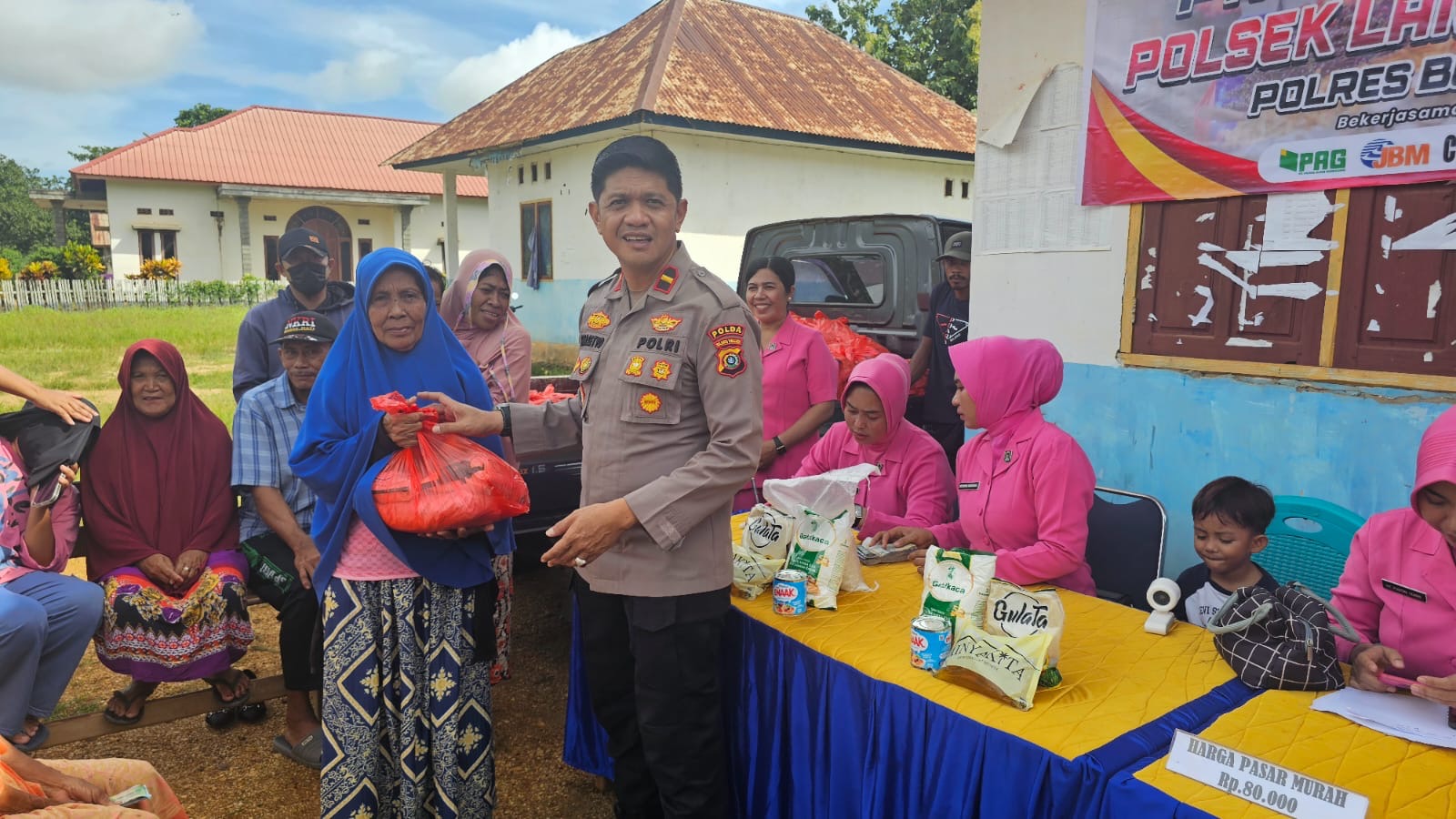 Kapolsek Lantari Jaya, IPDA Prasetyo Nento, menggandeng berbagai pihak dalam penyelenggaraan pasar murah ini, di antaranya PT JBM, PT PAG, CV MSP, serta Toko Ahmad Mas.