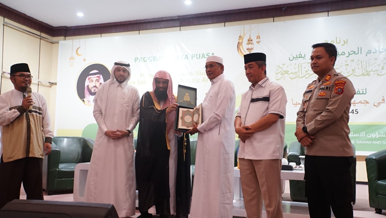 Diakhir acara, Kepala Atase Agama Kedutaan Besar Kerajaan Arab Saudi berikan Cenderamata berupa Al-Qur’an bertinta Emas kepada Pj. Wali Kota Kendari dan Al-Qur’an kepada pengurus masjid yang ada di Kota Kendari. (wan/Kom/adv)
