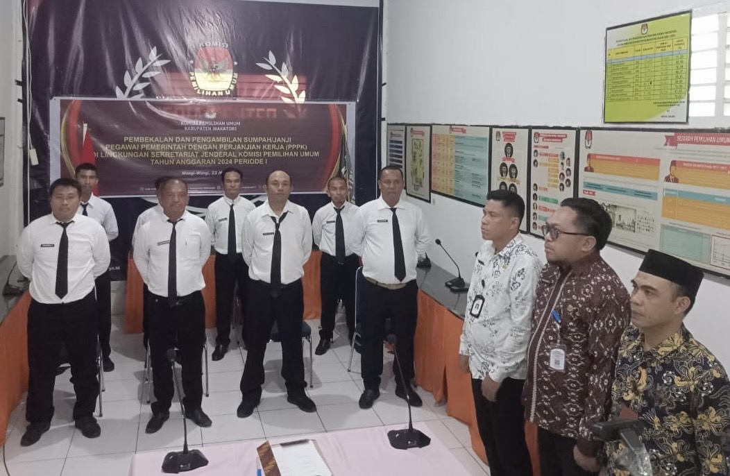 RADARKENDARI.COM, Wakatobi, Sulawesi Tenggara – Sekretaris Jenderal (Sekjen) Komisi Pemilihan Umum (KPU) RI, Bernard Dermawan Sutrisno, melantik 8 Pegawai Pemerintah dengan Perjanjian Kerja (P3K) di lingkungan Sekretariat KPU Kabupaten Wakatobi pada Jumat, (23/05/2025).