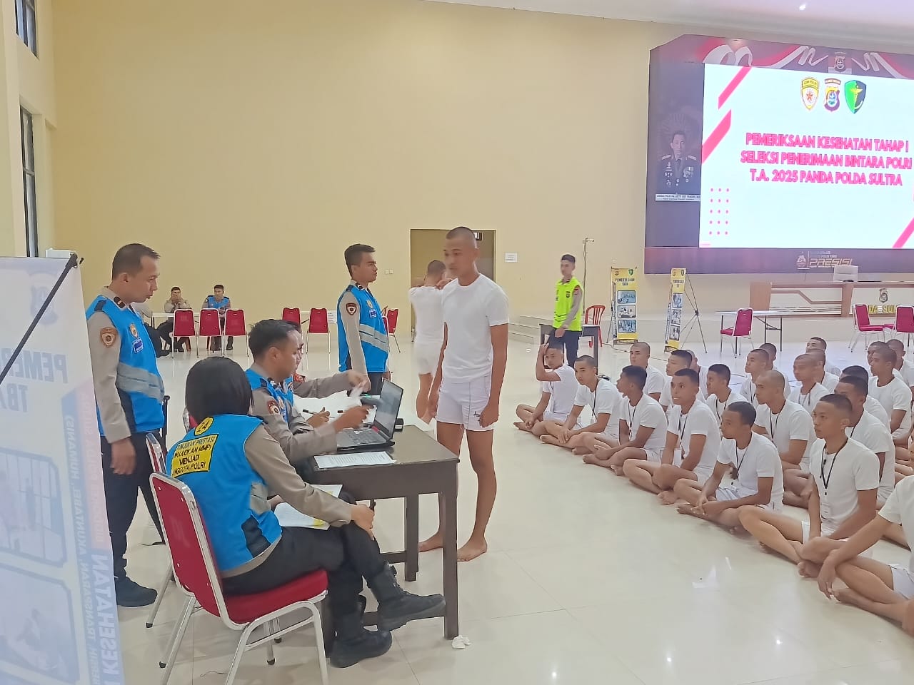 RADARKENDARI.COM, Kendari– Pelaksanaan pemeriksaan kesehatan (Rikkes) tahap pertama dalam seleksi penerimaan Bintara Polri T.A 2025 di Polda Sulawesi Tenggara (Sultra) berlangsung di Aula Dhalas Polda Sultra, Rabu (9/4/2025).