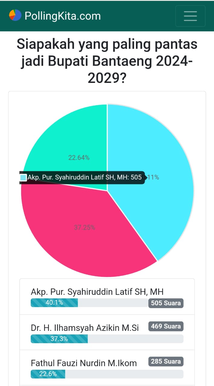 Data polling dari situs PollingKita.com menunjukkan AKP (Pur) Syahiruddin Latif meraih dukungan sebanyak 40% dari total suara, menjadikannya kandidat teratas sejauh ini. Dengan latar belakang hukum yang kuat dan pengalaman di bidang kepolisian, ia dinilai sebagai calon yang mampu membawa perubahan dan keamanan bagi Bantaeng.
